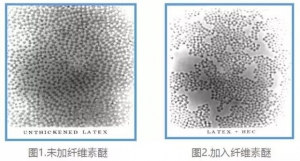 圖1是沒(méi)有添加纖維素醚時(shí)的乳膠粒子,乳膠粒子均勻的分散;